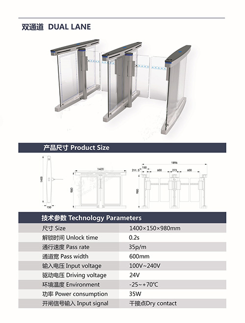 1.速通門B323A系統(tǒng)具備防撞功能,當(dāng)有外物在未授權(quán)的狀態(tài)下撞擊擺桿,擺桿運(yùn)動(dòng)角度達(dá)到菜單設(shè)定的值(如 2°),控制器_會(huì)啟動(dòng)剎車機(jī)構(gòu),阻止擺桿運(yùn)動(dòng),并啟動(dòng)聲光報(bào)警。當(dāng)外力進(jìn)一步增大,剎車控制器會(huì)保護(hù)擺桿不被撞斷,外力撤除后,擺桿自動(dòng)歸位,系統(tǒng)正常; 2.速通門B323A系統(tǒng)具備角度分辨和零位自檢功能,包含 500P/R 編碼器,分辨精度高,這種高精度的傳感器的優(yōu)勢是使擺桿轉(zhuǎn)動(dòng)_; 3.非法進(jìn)入有報(bào)警提示功能; 4.防沖功能,在沒有接收功能開閘信號(hào),擺臂自動(dòng)鎖死; 5.紅外防夾功能,在擺臂復(fù)位的過程中紅外檢測到人在通道中,擺臂會(huì)自動(dòng)回到打開狀態(tài); 6.速通門B323A統(tǒng)一標(biāo)準(zhǔn)的對外電氣接口,可與多種讀卡器相掛接,并可通過管理計(jì)算機(jī)實(shí)現(xiàn)遠(yuǎn)程控制與管理; 7.系統(tǒng)設(shè)有過流保護(hù)裝置,當(dāng)負(fù)載_過某設(shè)定值(如 2._),系統(tǒng)停止工作,以免燒壞電機(jī)等設(shè)備;